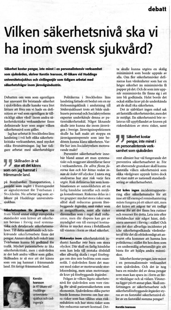 Jag skrev om säkerhetsnivåer för sjukvården i Dagens Medicin i maj 2002. Artikeln är fortfarande mycket aktuell, för inte har det hänt så mycket under alla dessa år. Nedan finns en kopia på den debattartikeln:
